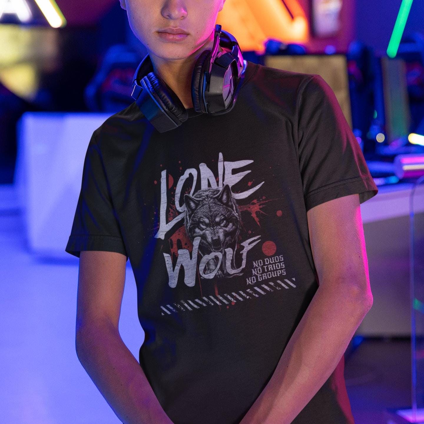 Embrace the solo hunt with the Lone Wolf T-Shirt! This badass graphic tee showcases your independence. Ideal for battle royale pros, survival grinders, or anyone who thrives flying solo in the chaos.