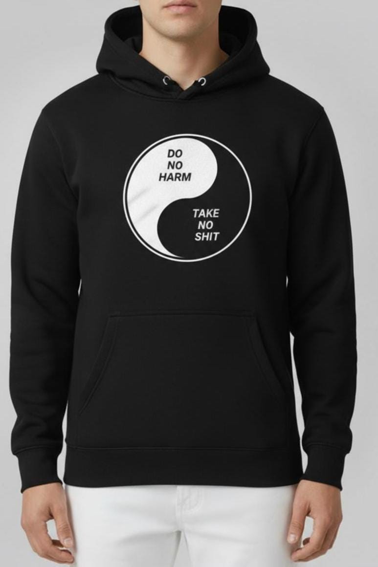 Embrace the ultimate balance of Zen wisdom and zero-tolerance attitude with our Do No Harm Take No Shit Yin Yang Hoodie! Make it your wearable manifesto for the modern mystic who practices compassion by day and fierce boundaries by night.