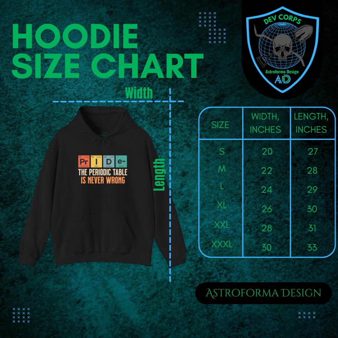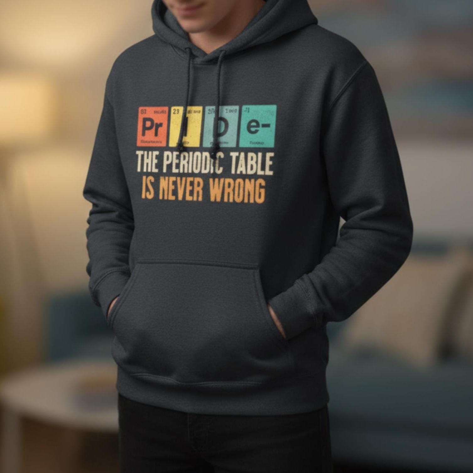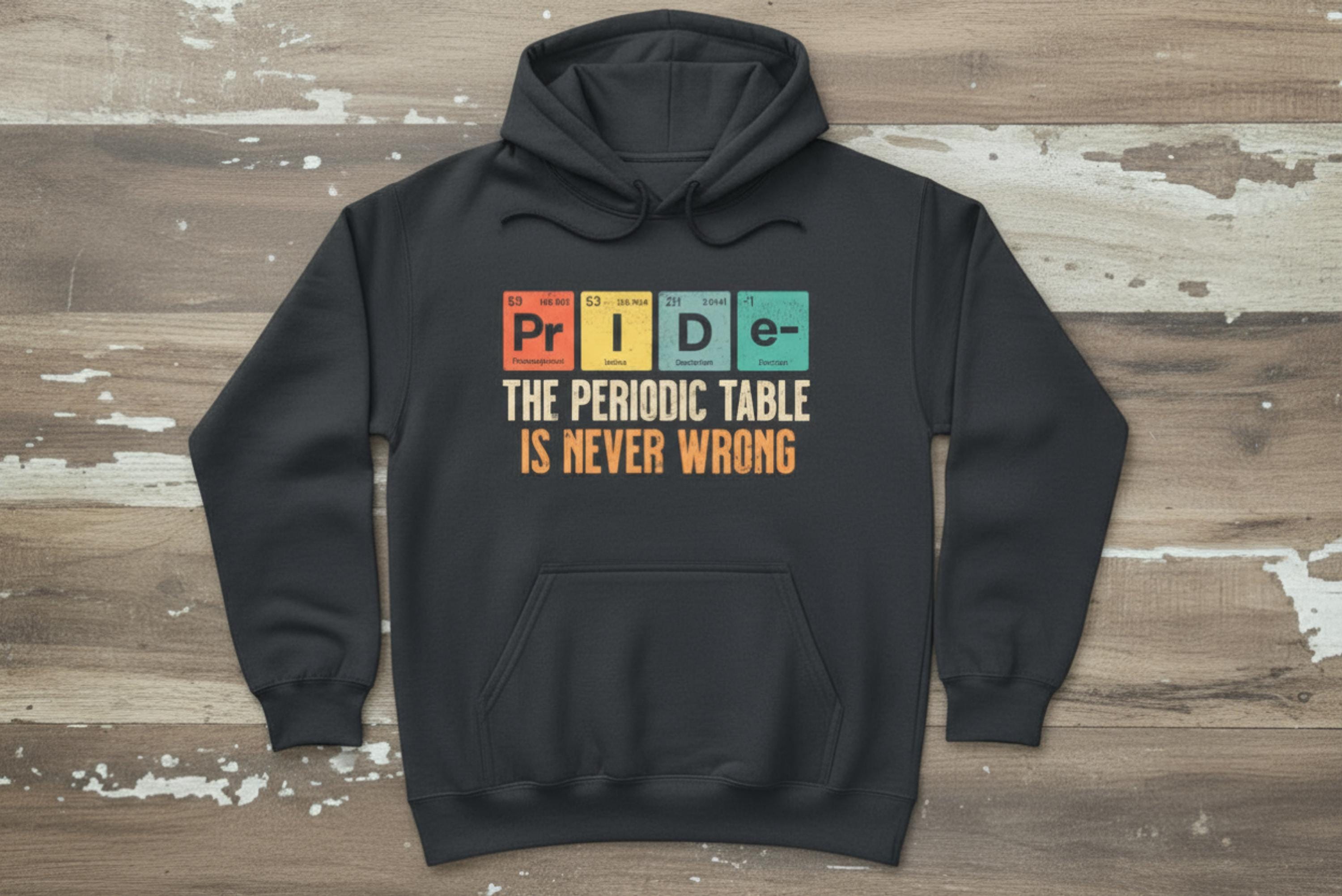 Decode the genius pun with our elemental wordplay: "PRIDE" spelled out via Pr (59, orange block), I (53, yellow), De (implied from design)—framed by the iconic table motif, crowned with "THE PERIODIC TABLE IS NEVER WRONG". It's that brainy banter for chemists, educators, or anyone.