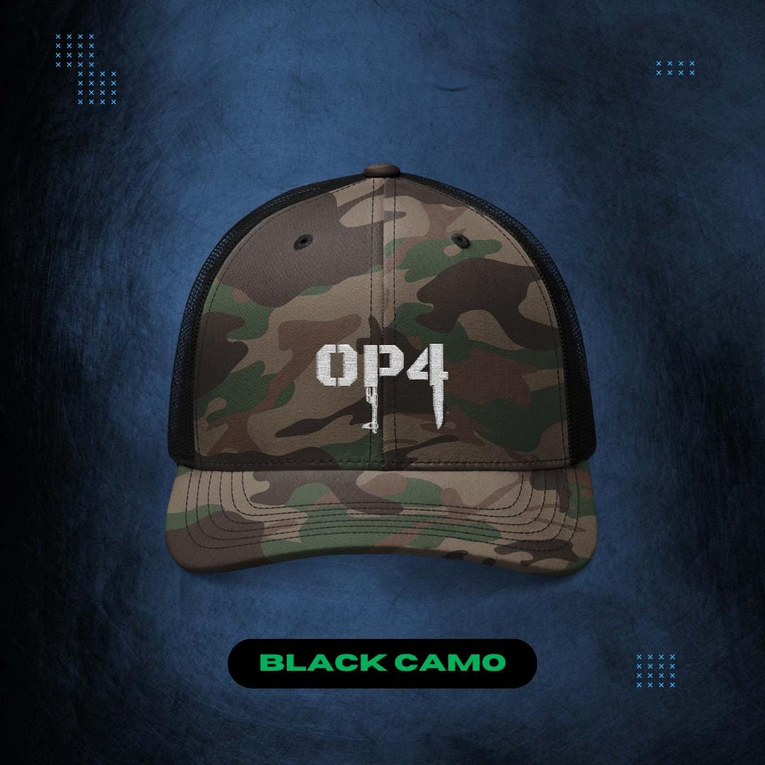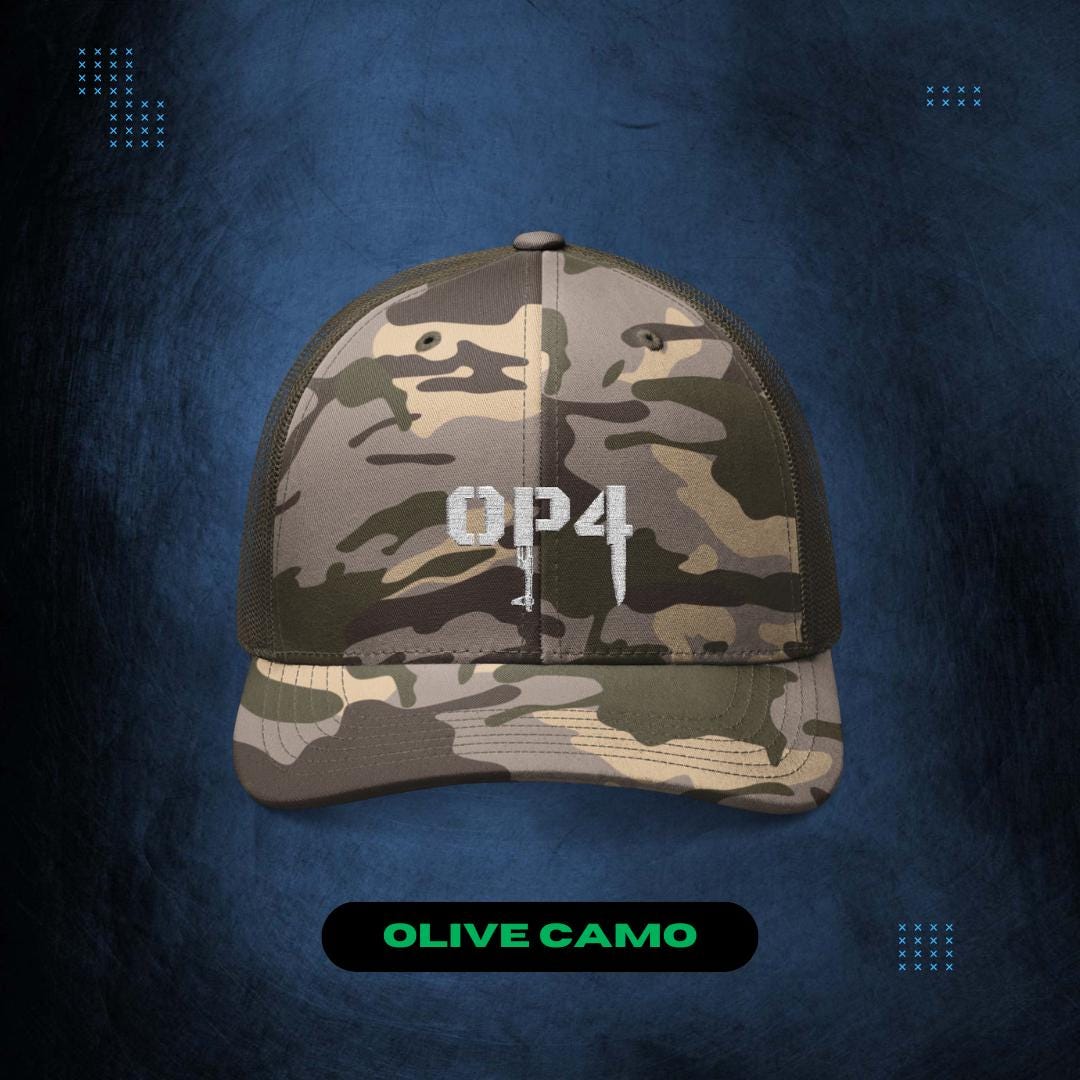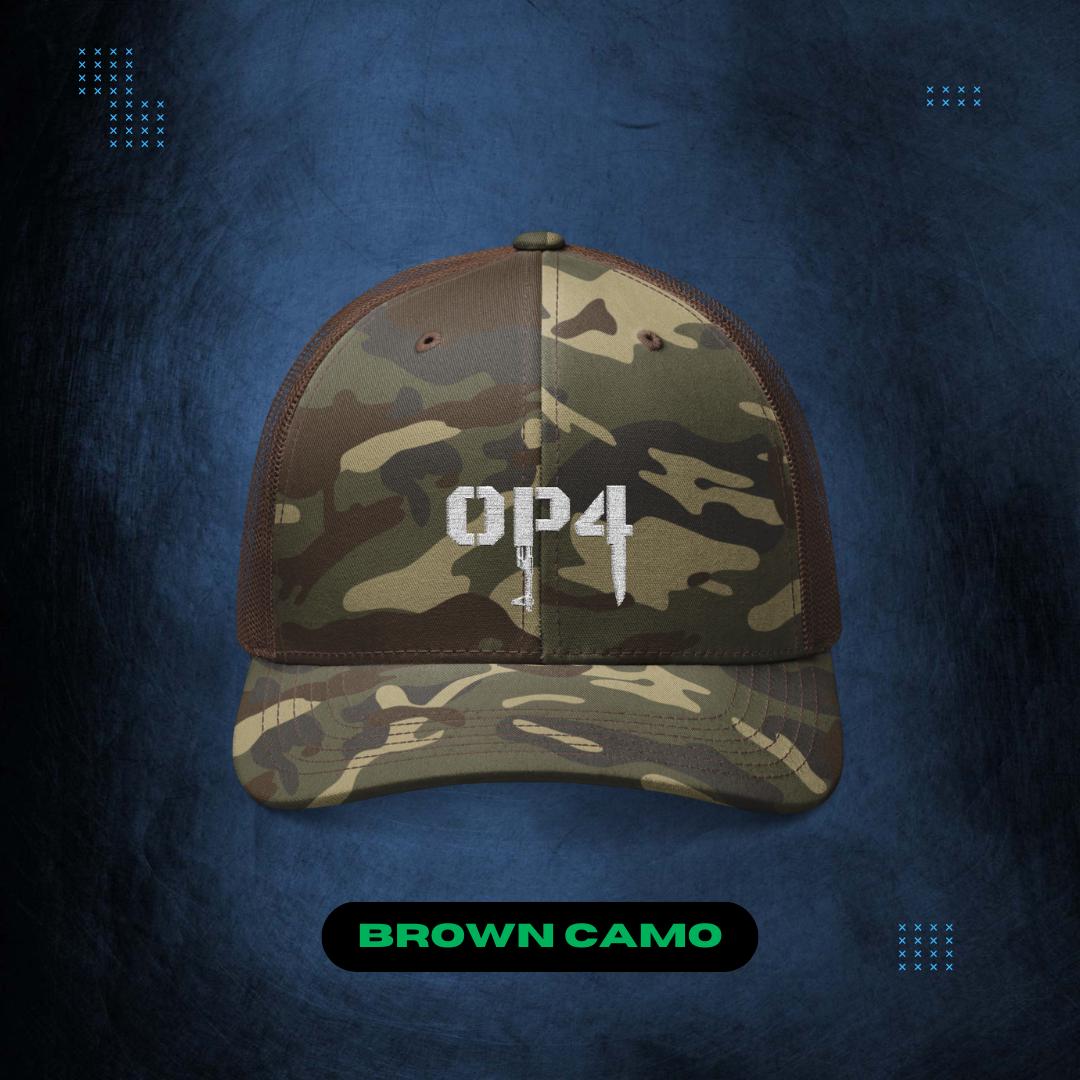 Top off your look with one of our Op4 camo trucker hats, emblazoned with a sharp white OP4 logo for that authentic survival vibe. Featuring a mesh back for breathability and an adjustable snapback for a perfect fit, it's built for outdoor adventures or intense gaming marathons. Show your support for the OP4 gaming community while staying shaded and stylish. Ideal for blending strategy and streetwear in one versatile accessory.