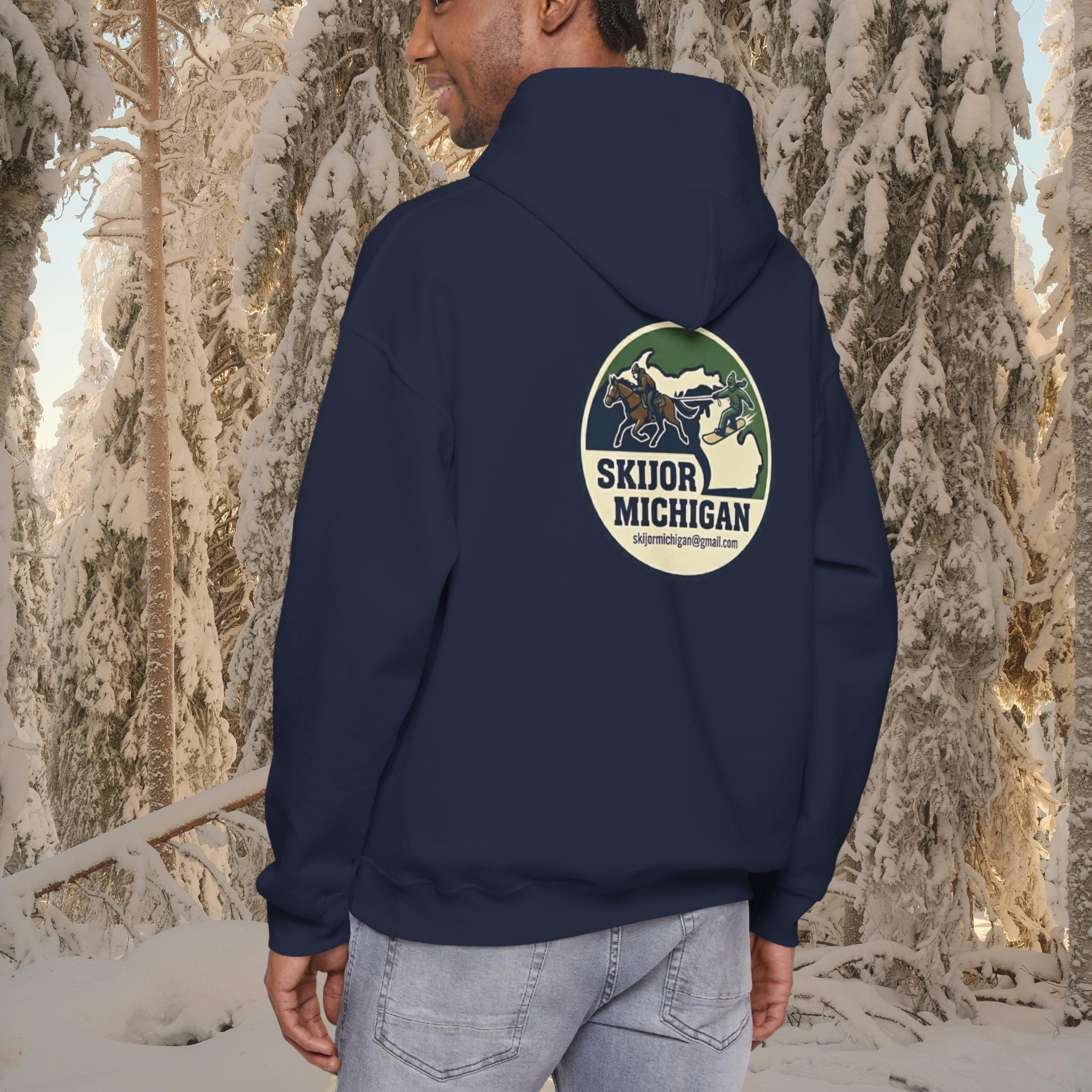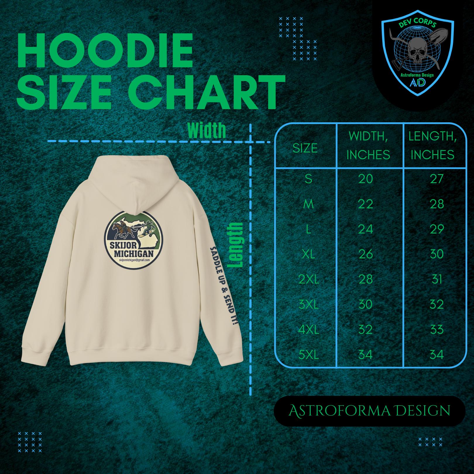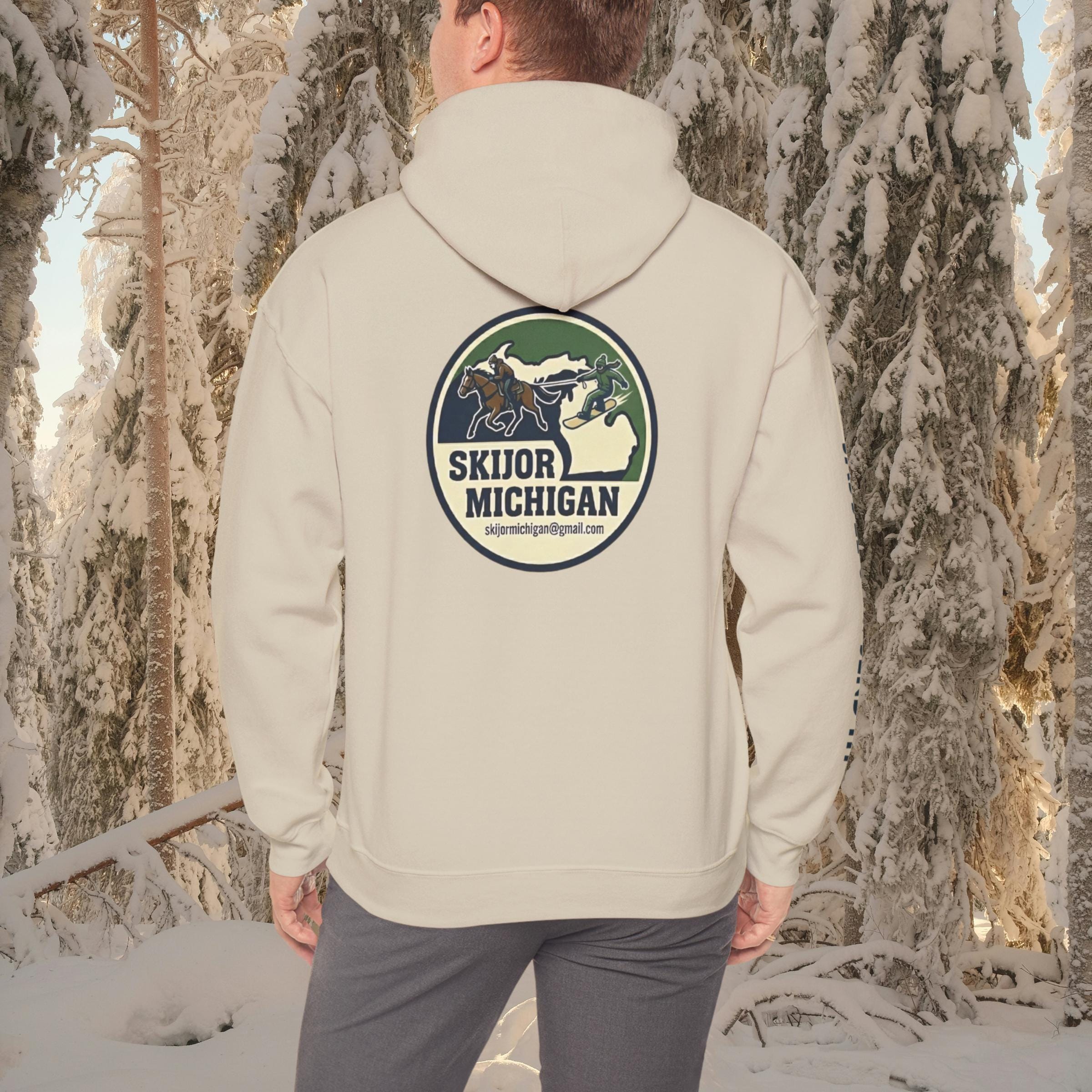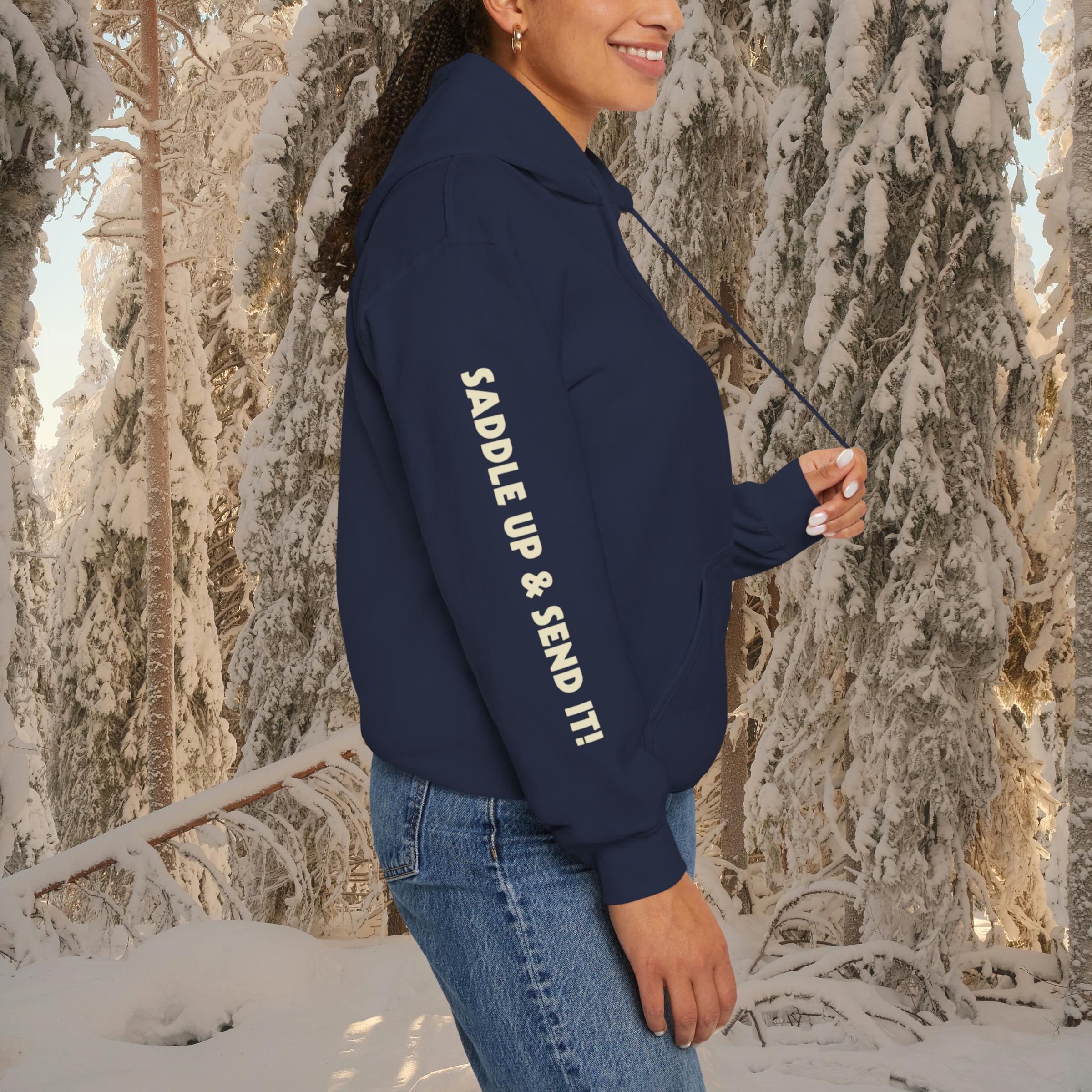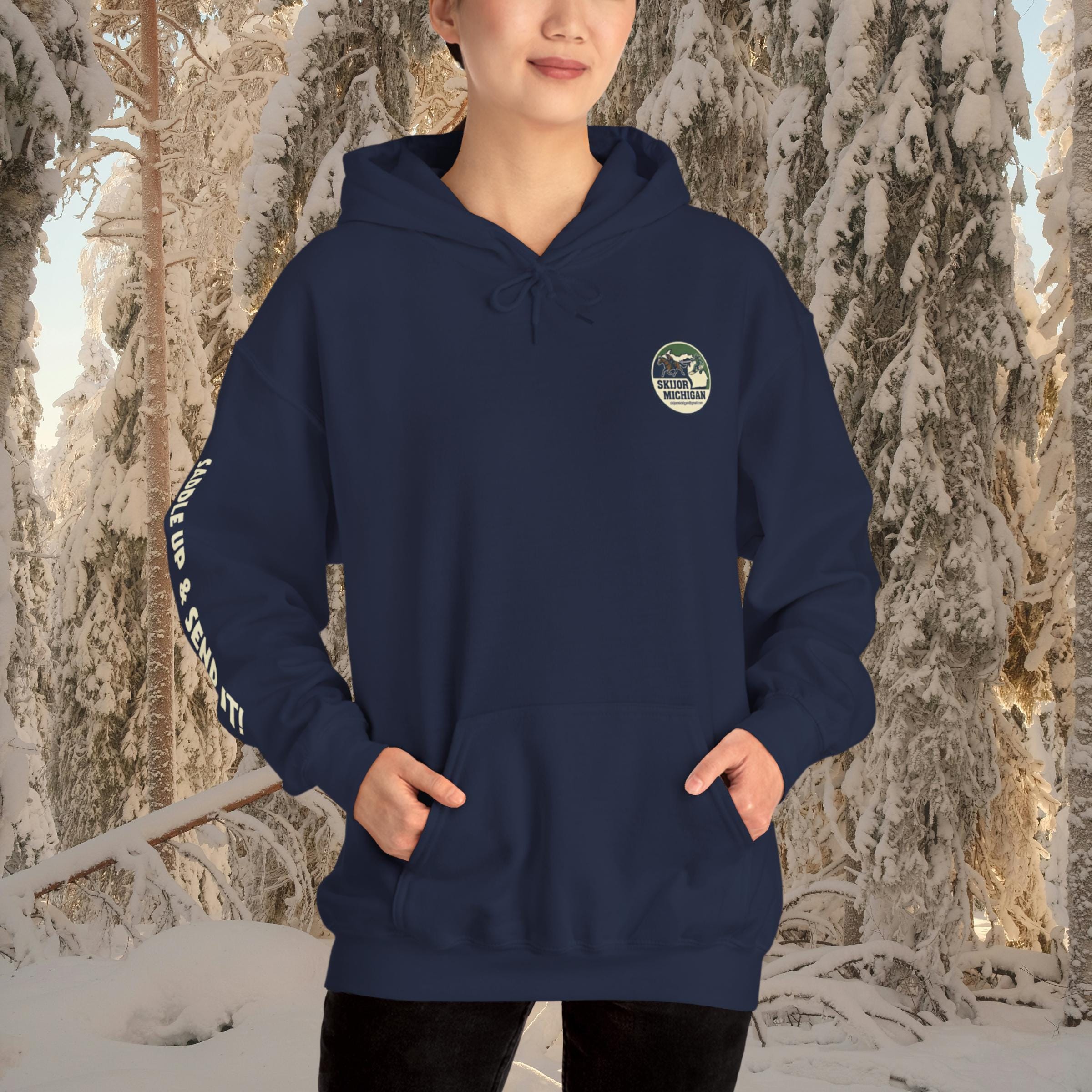 Hit the snow with Michigan Skijor style in this exclusive hoodie! Featuring the snowboarder variant of our official design—horsepower meets big-mountain vibes as a rider tows a snowboarder through gates, jumps, and pure adrenaline. "Saddle Up & Send It!" is the ultimate call to action for anyone who's felt the rush of being pulled at speed on a board.