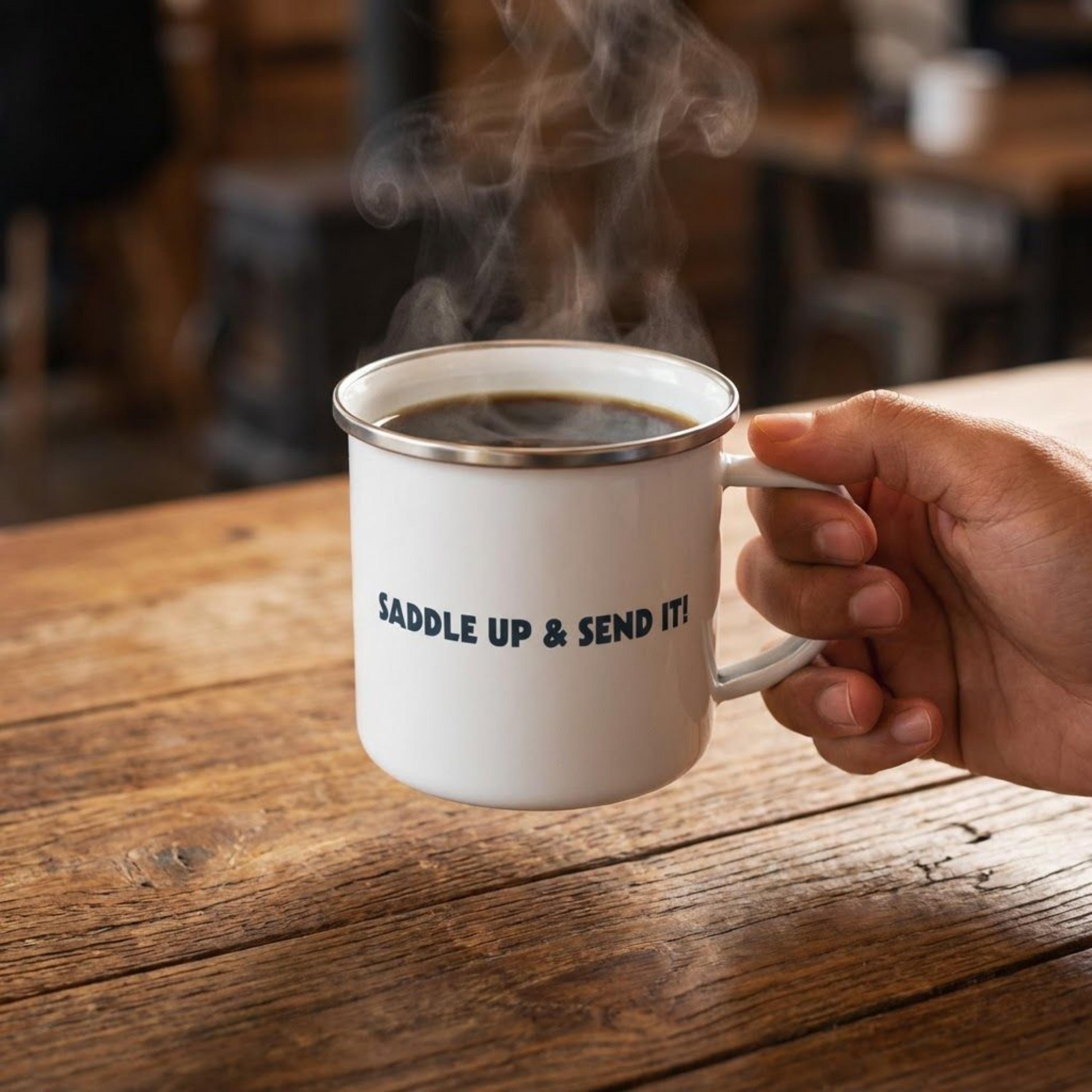Start your morning with Michigan Skijor pride in this tough 12 oz enamel mug! Featuring our official snowboarder logo plus "SADDLE UP & SEND IT!" on the reverse side. It's built for the real deal: cold mornings at Harbor Springs events, bonfires, or just fueling up before hitting the trails.