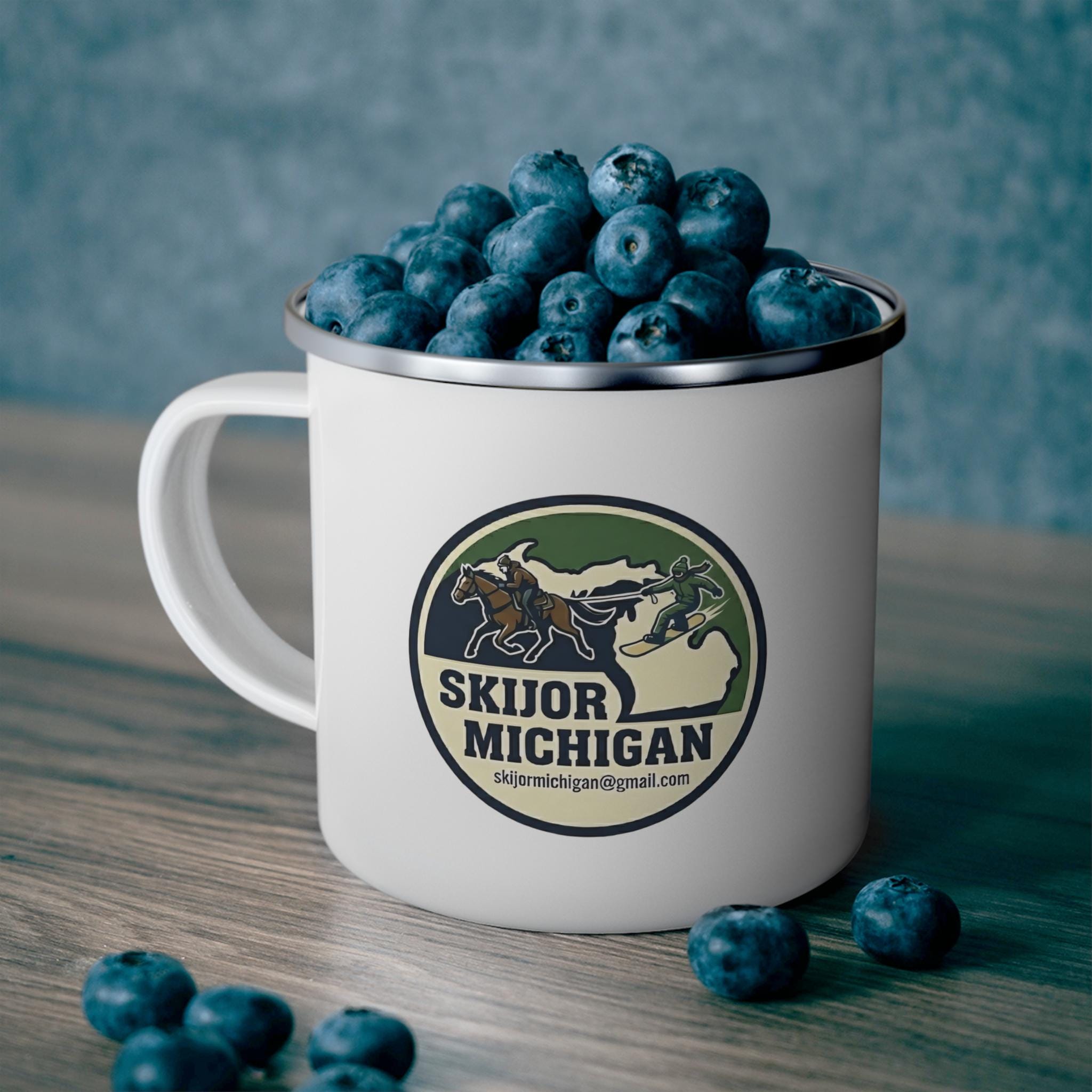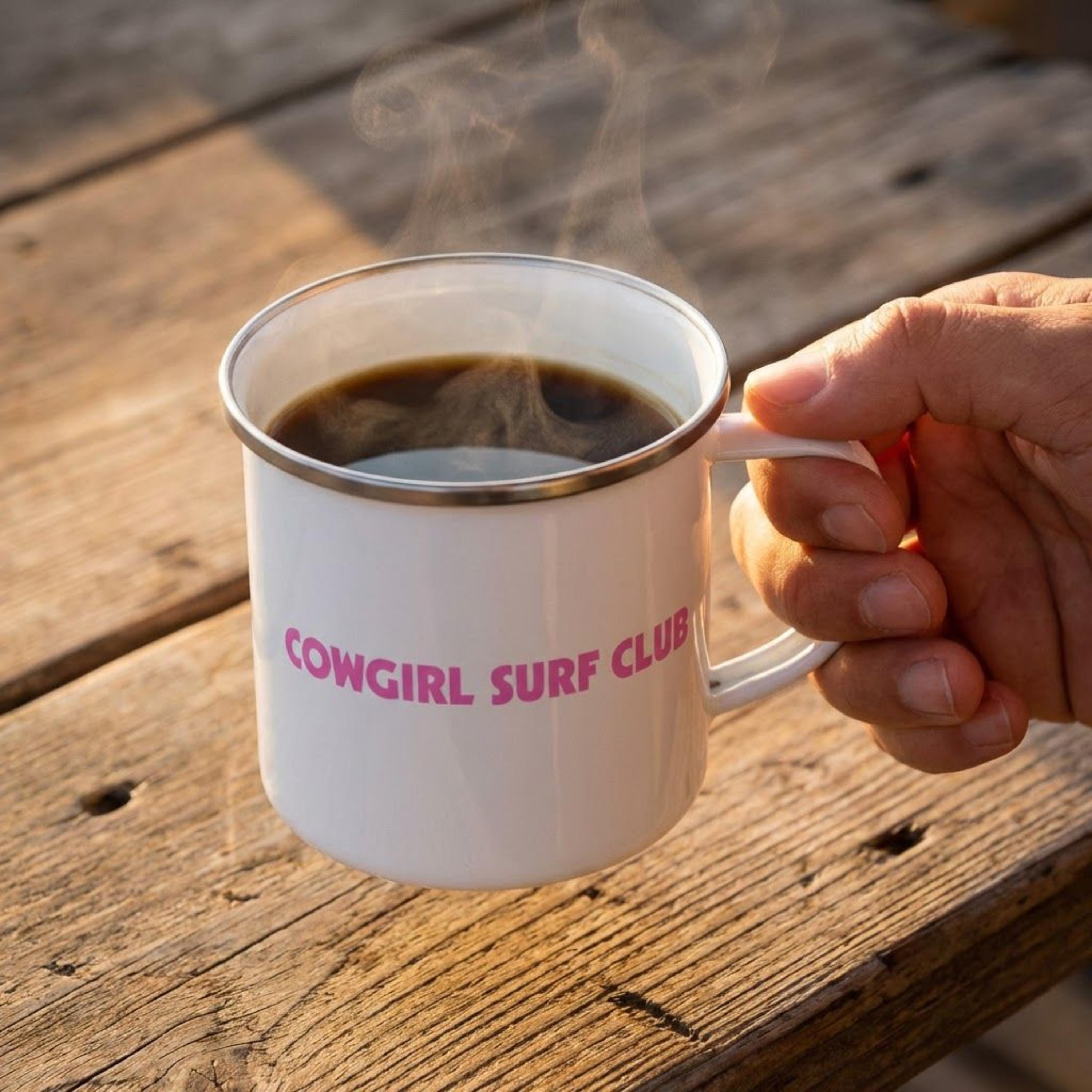 Start your morning with Michigan Skijor pride in this tough 12 oz enamel mug! Featuring our official snowboarder logo plus "COWGIRL SURF CLUB" on the reverse side. It's built for the real deal: cold mornings at Harbor Springs events, bonfires, or just fueling up before hitting the trails.