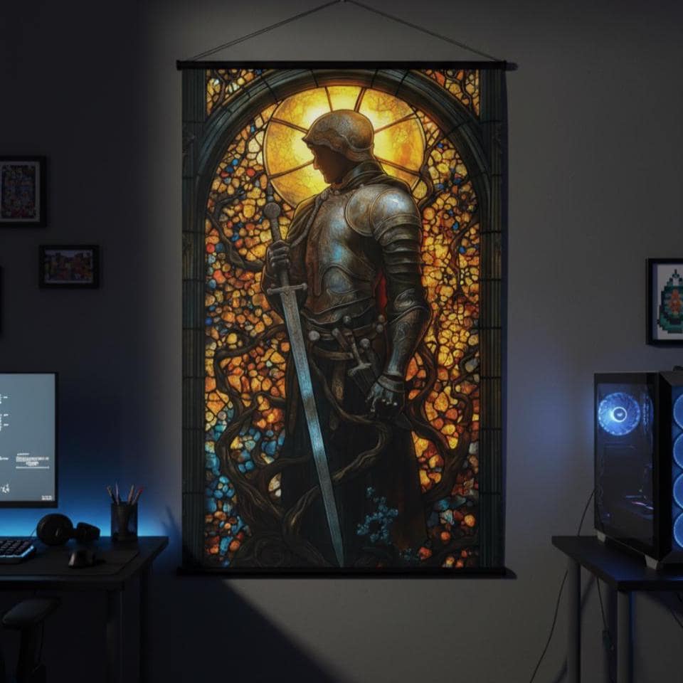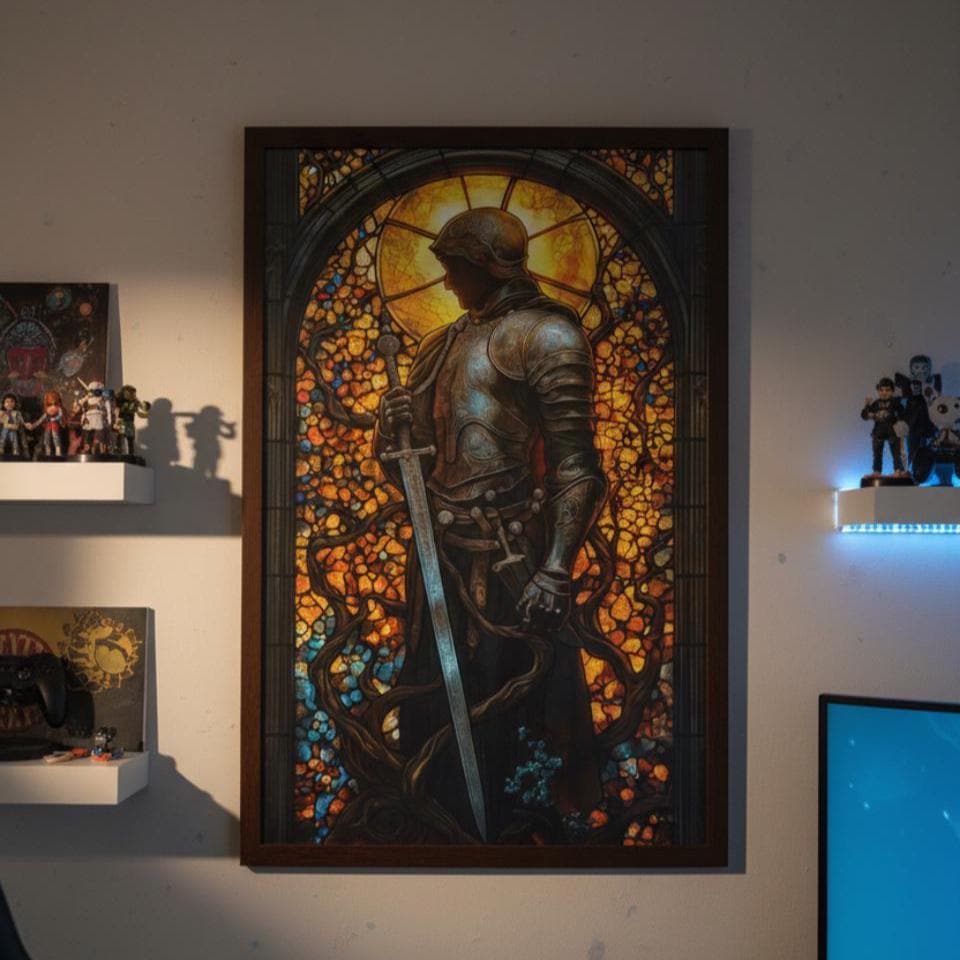 Stand ready for battle with this Golden Helm Knight Stained Glass poster! Perfect for anyone building an epic gaming room. The glowing details pop beautifully under RGB lights. Legendary gamer gift for the frontline fighter or knight enthusiast.