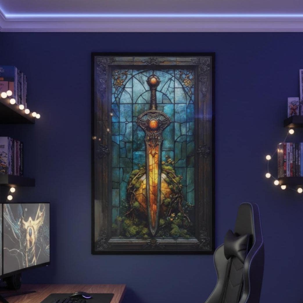 Pull legendary power into your space with this Enchanted Sword Stained Glass poster! Perfect for D&D players, sword collectors, fantasy RPG fans, or anyone who wants a powerful, magical statement piece. The luminous colors pop under RGB lights and instantly give any gaming lair that ancient cathedral or legendary artifact vibe.