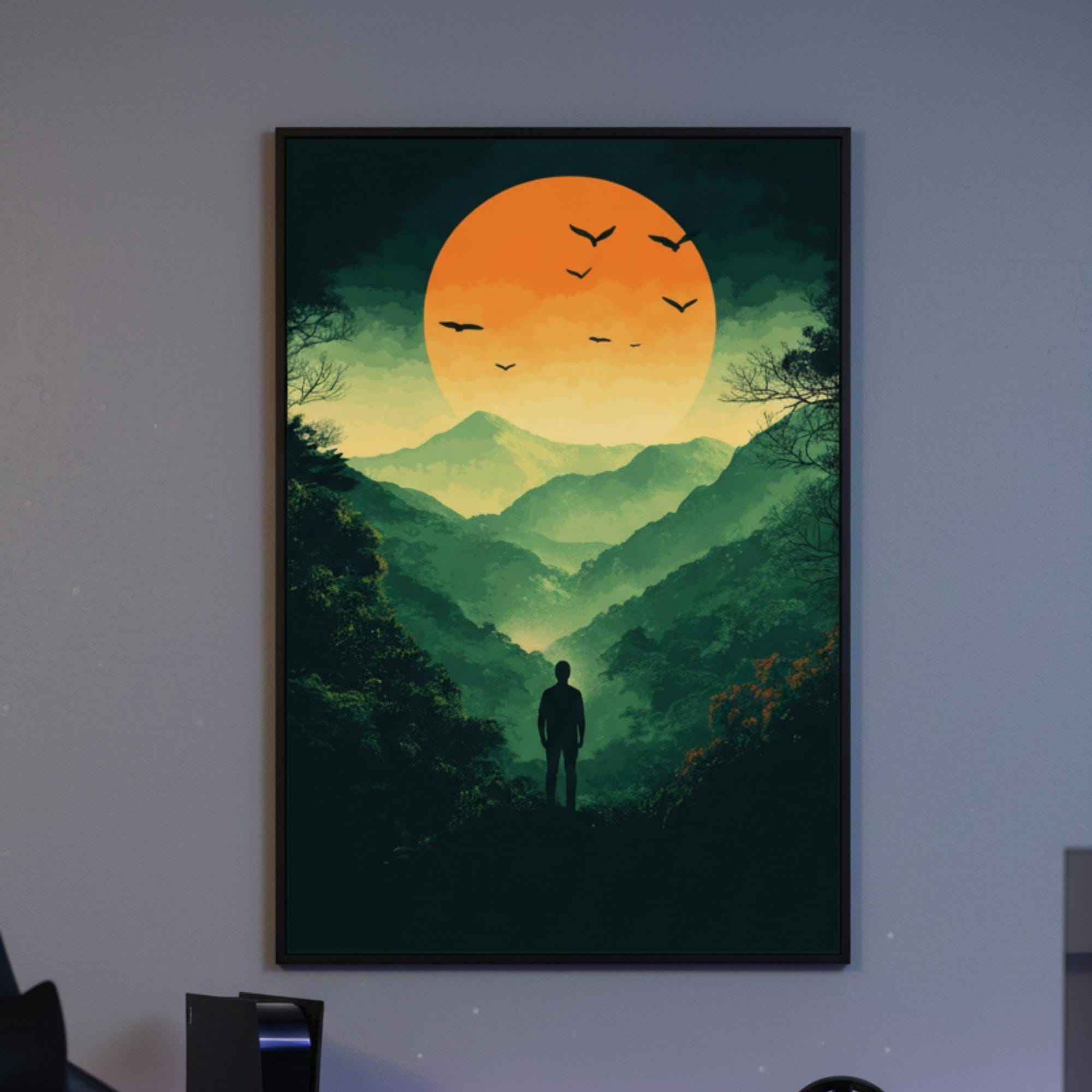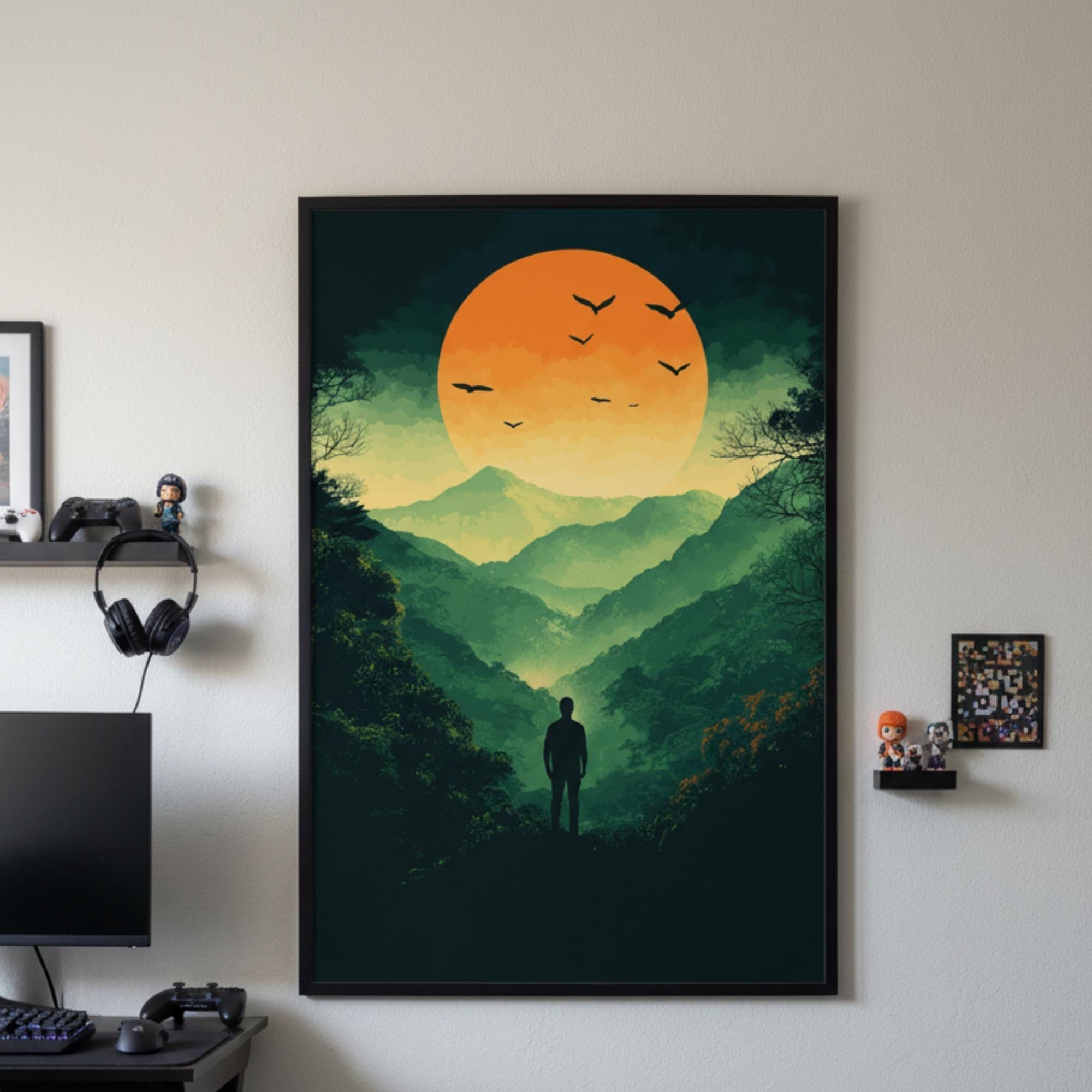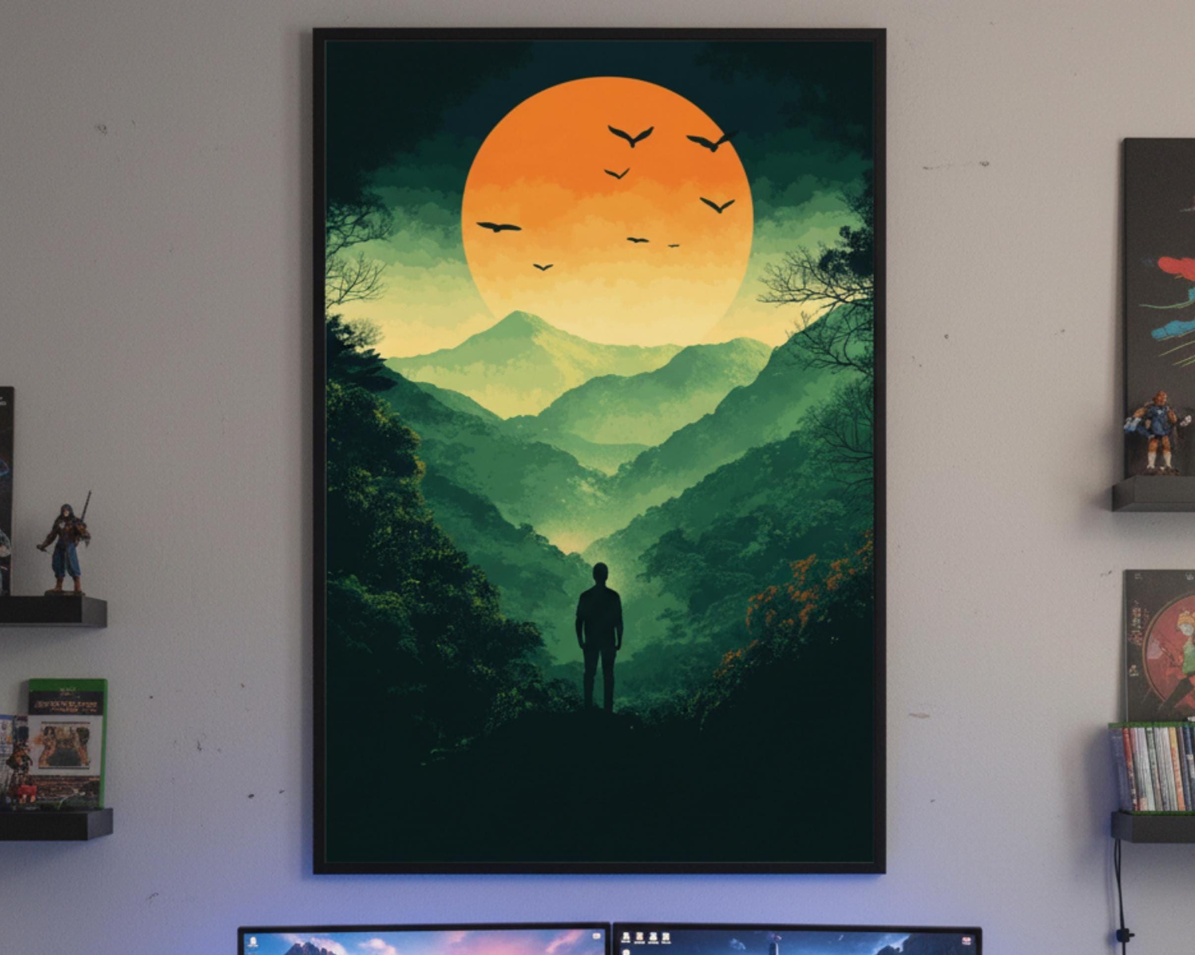 Step into the unknown with this Epic Valley Overlook poster! Perfect for wilderness explorers, open-world RPG fans, or anyone who wants an epic yet motivational focal point in their setup. The rich greens and fiery orange tones pop beautifully under RGB lights and instantly turn any wall into a gateway to new quests. Fantastic gamer gift for the adventurer, Dungeon Master, or anyone who needs daily inspiration that every legendary campaign starts with a single step into the unknown.